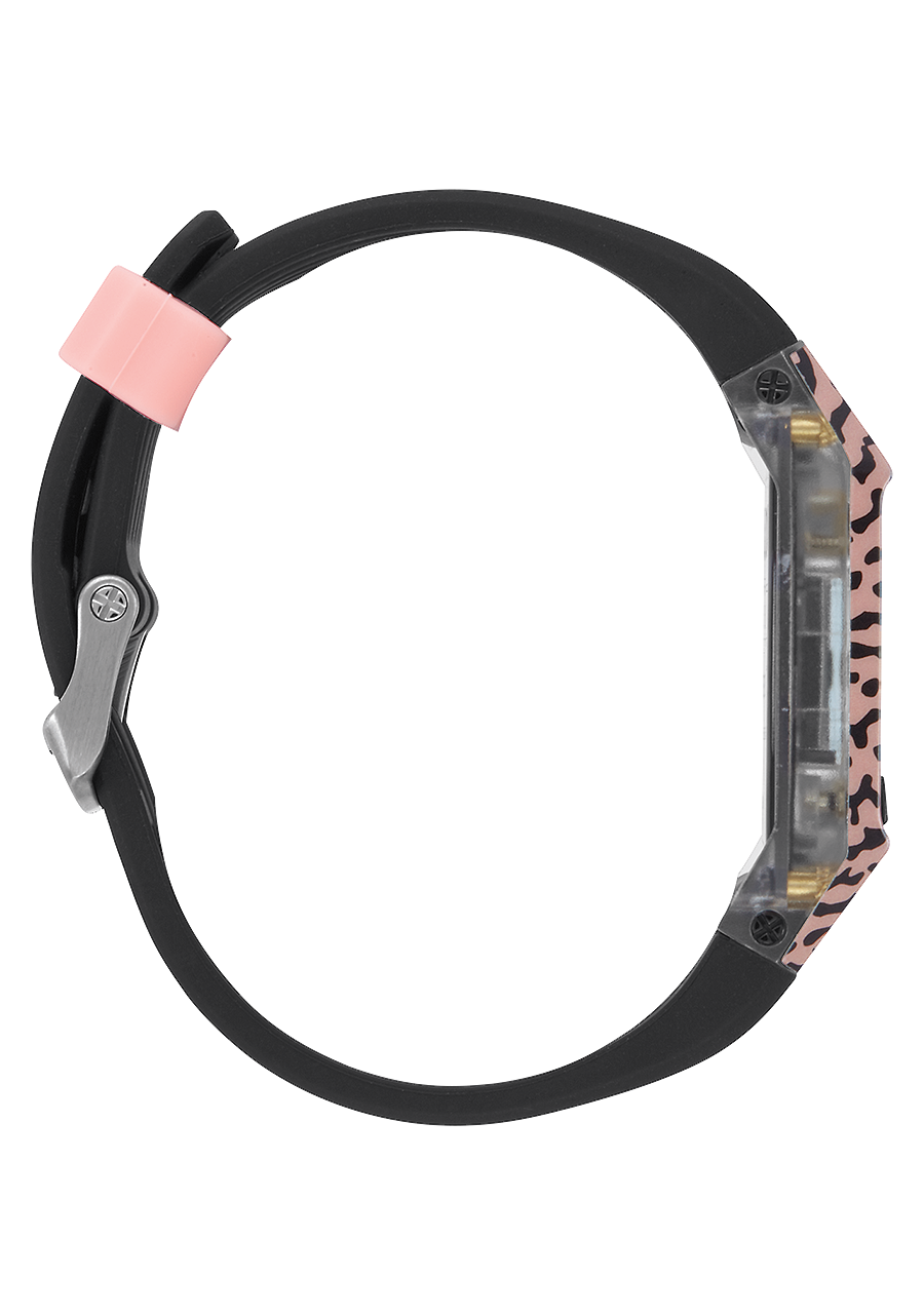 31 mm, 100 Meter/10 ATM, maßgefertigtes Spritzguss-TR90. Das Gehäuse ist transparent mit matter Textur und entweder in transparenter Farbe oder mit einer maßgefertigten hochauflösenden Grafik im Spritzgussverfahren versehen. Maßgefertigte Polycarbonat-Druckknöpfe mit dreifacher Dichtung, Edelstahl-Schraubboden und Edelstahl-Schraubstegösen.