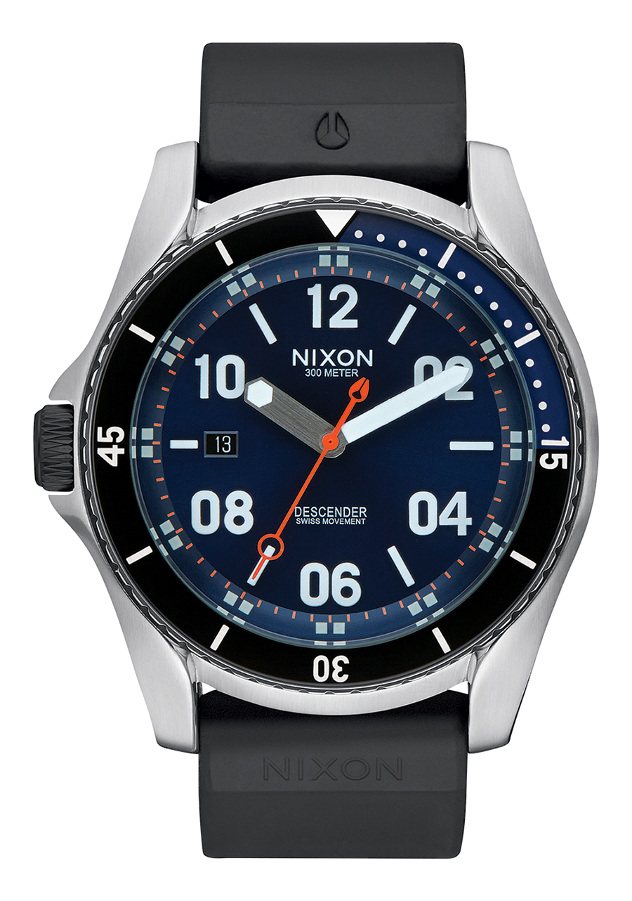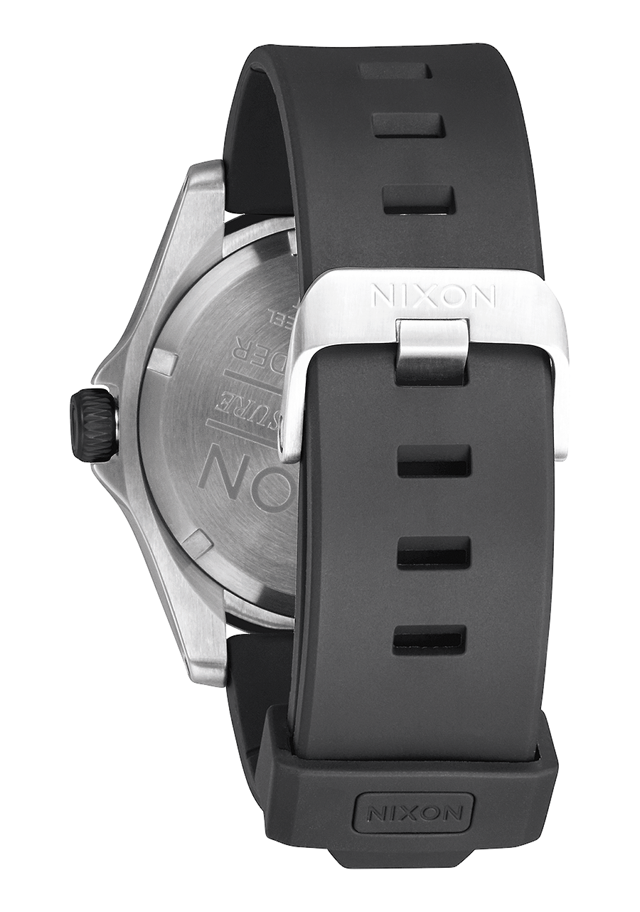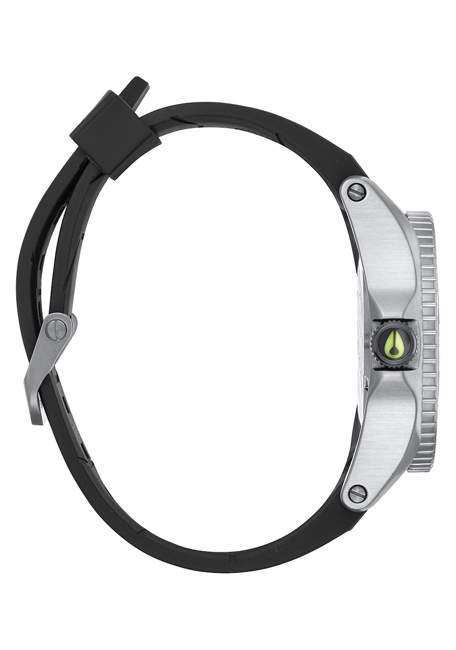 Die krallenförmige, gerändelte Krone ist von einem integrierten Kronenschutz umrahmt. Die Krone befindet sich bei 9 Uhr, um ein Einschneiden am Handgelenk während Aktivitäten zu verhindern. Außerdem verfügt die Uhr über eine einseitig drehbare Lünette für einen analogen Countdown-Timer.