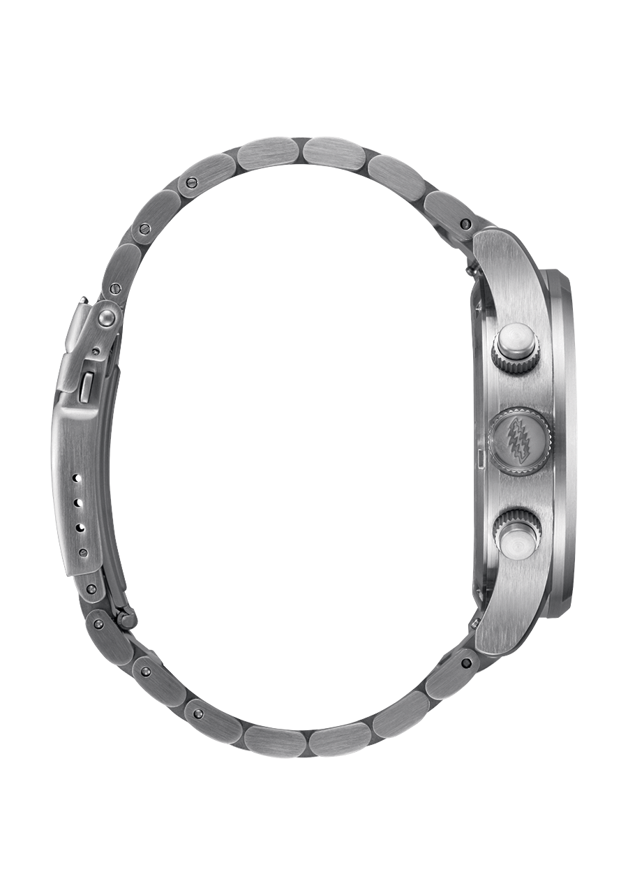 Maßgefertigter Grateful Dead 13-zackiger Blitz-Sekundenzeiger und mit Emaille gefüllte Krone bei 3 Uhr mit eingraviertem 13-zackigem Blitz. Der 6-Zeiger-Chronograph zeigt 3 Steal Your Face Totenköpfe neben dem Datumsfenster bei 4 Uhr.