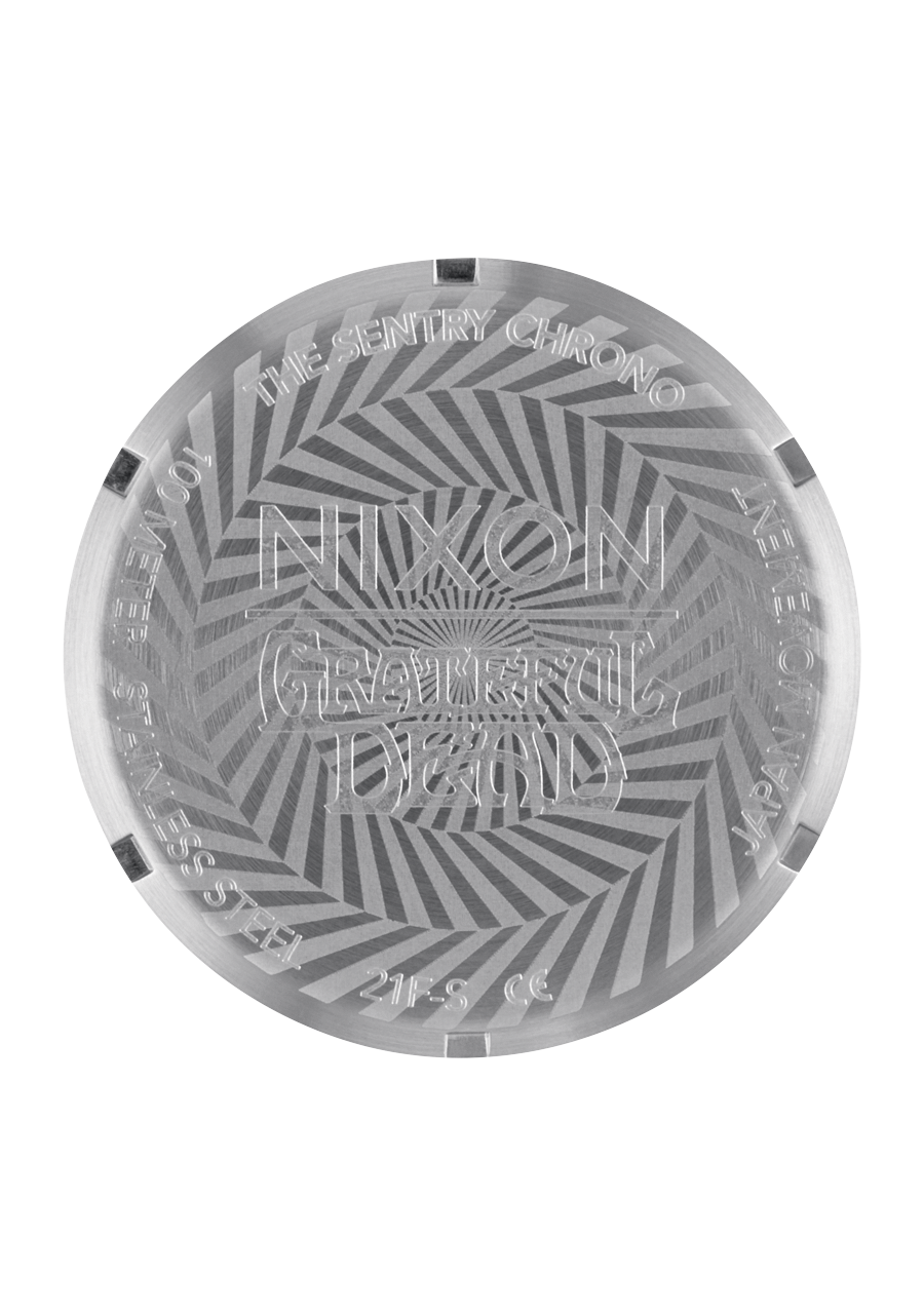 23-20mm konisch zulaufendes, maßgefertigtes, massives Edelstahl-3-Glieder-Armband mit Schnellwechsel-Federstegen und Edelstahl-Doppelverschluss mit Mikroverstellung. Maßgefertigtes 23mm echtes Lederarmband mit geprägtem Grateful Dead-Muster und Schnellwechsel-Federstegen ebenfalls enthalten.
