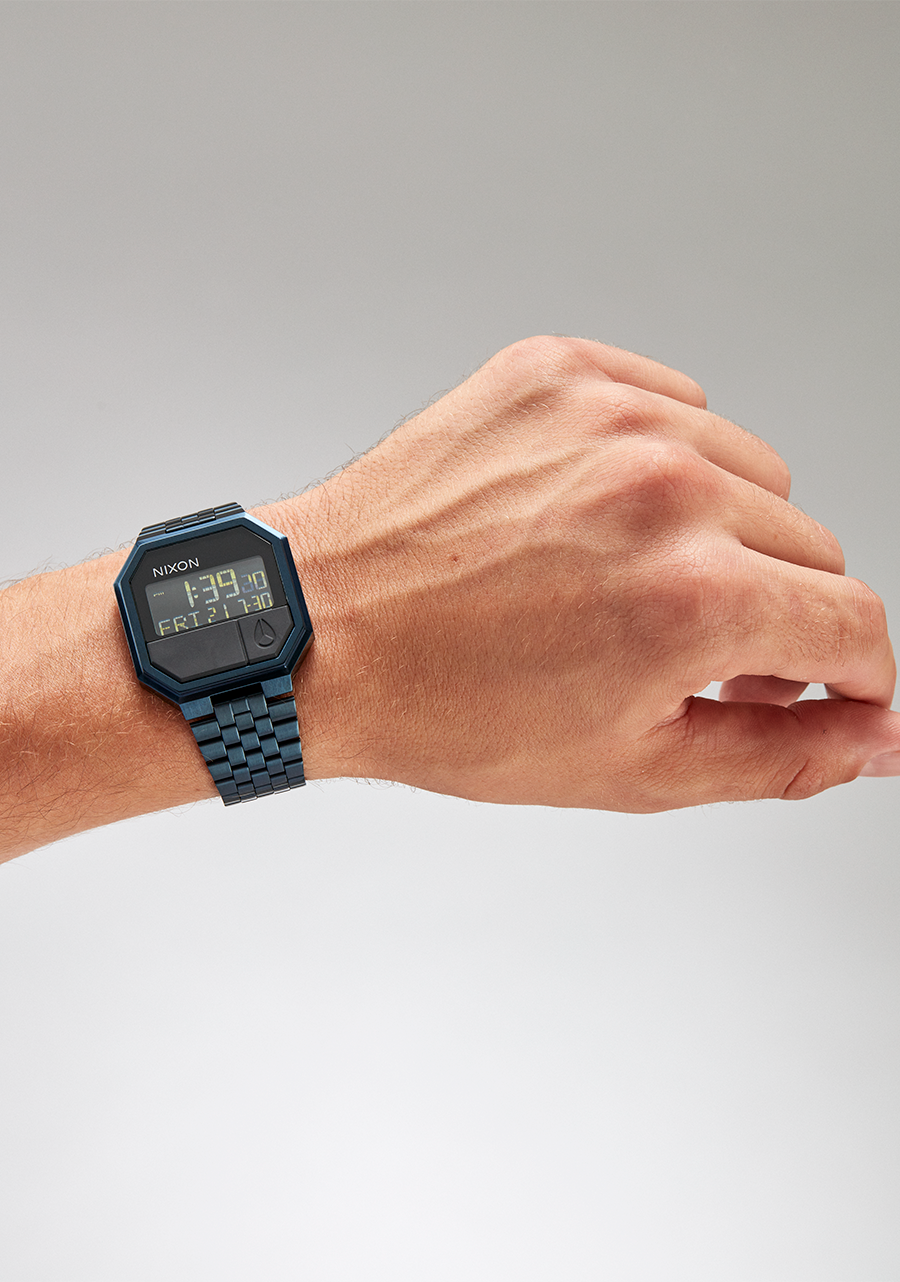 Um das Edelstahlarmband der Re-Run für einen sicheren Sitz anzupassen, können Sie die schiebbare Verstellschnalle verwenden, um das Band zu straffen oder zu lockern. Dies erfolgt durch Verschieben der Schnalle entlang des Bands auf die gewünschte Position. Ein Werkzeug zur ersten Einstellung ist im Uhrenkarton enthalten. Für weitere Informationen besuchen Sie den Nixon-Blog.