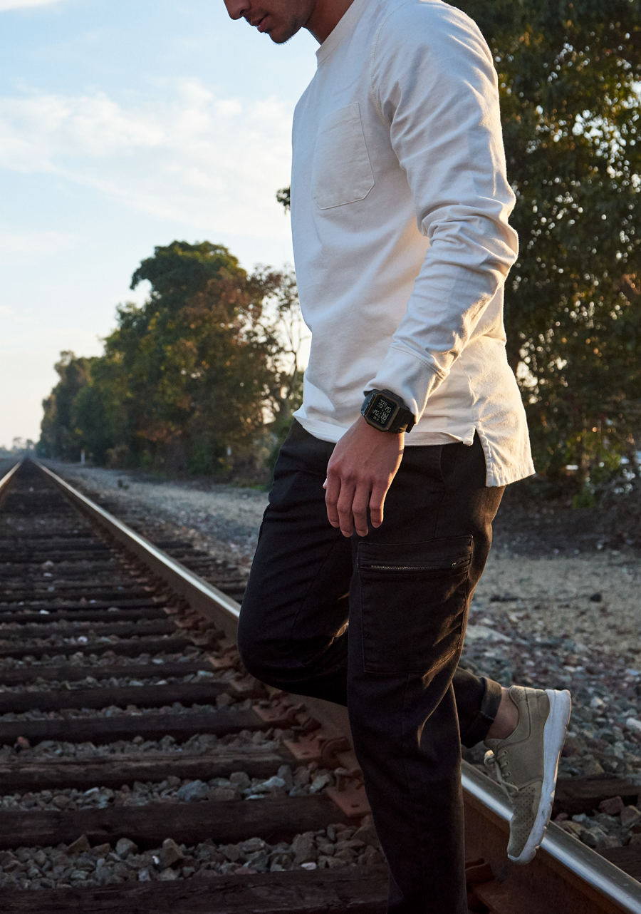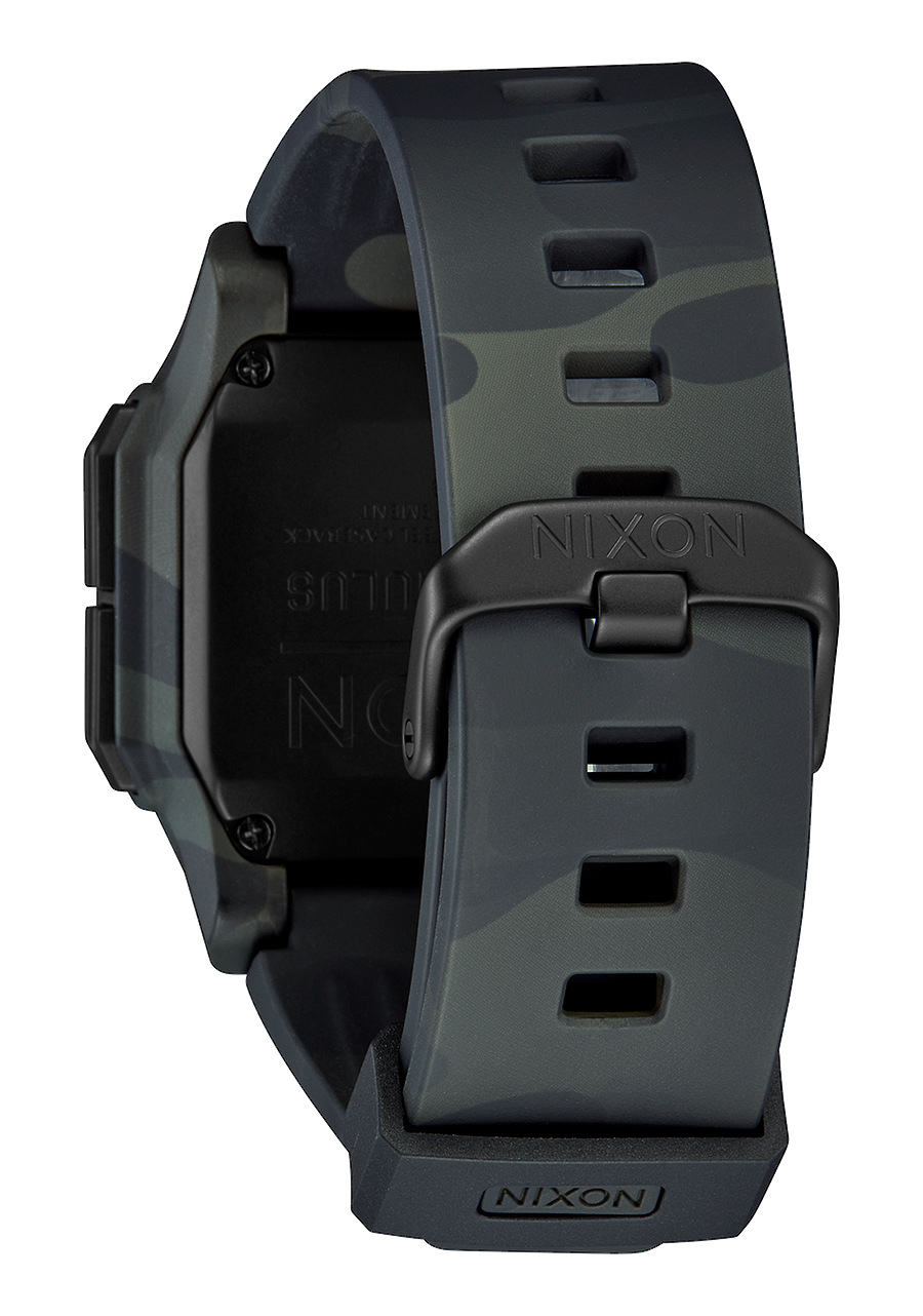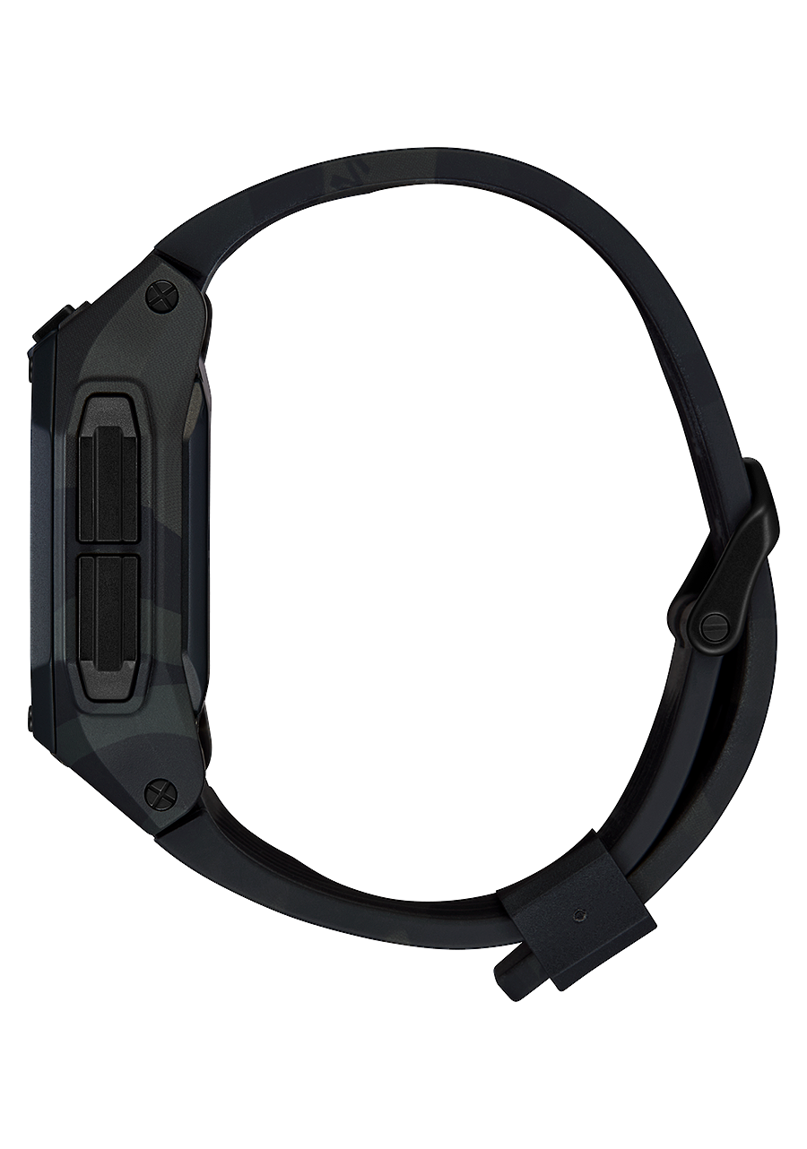 46 mm maßgefertigtes, spritzgegossenes TR-90-Gehäuse mit einer Wasserdichtigkeit von 100 Metern / 10 ATM. Maßgeschneidertes digitales LCD-Modul, eingebettet in eine schützende PU-Hülle und Poron-Schaumpolsterung. Ausgestattet mit Polycarbonat-Drückern bei 6 und 9 Uhr, gehärtetem Mineralglas, Edelstahl-Lünette, massivem Edelstahl-Schraubboden und Schraubstiftanstößen.