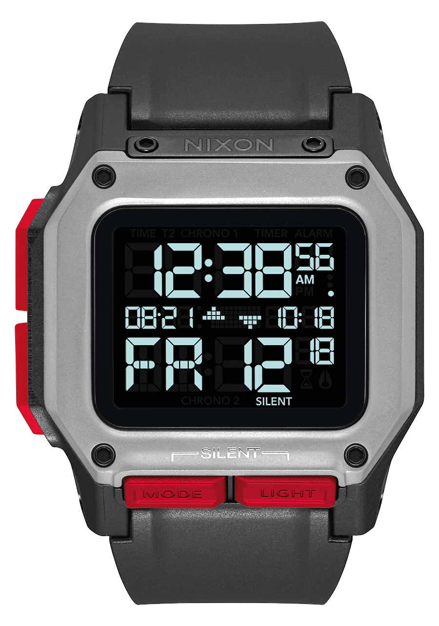 Der Nixon Regulus verfügt über doppelte Chronographen-Timer, drei unabhängige Alarme, einen Stummschaltungsmodus, eine verstellbare LED-Hintergrundbeleuchtung und ist wasserdicht.