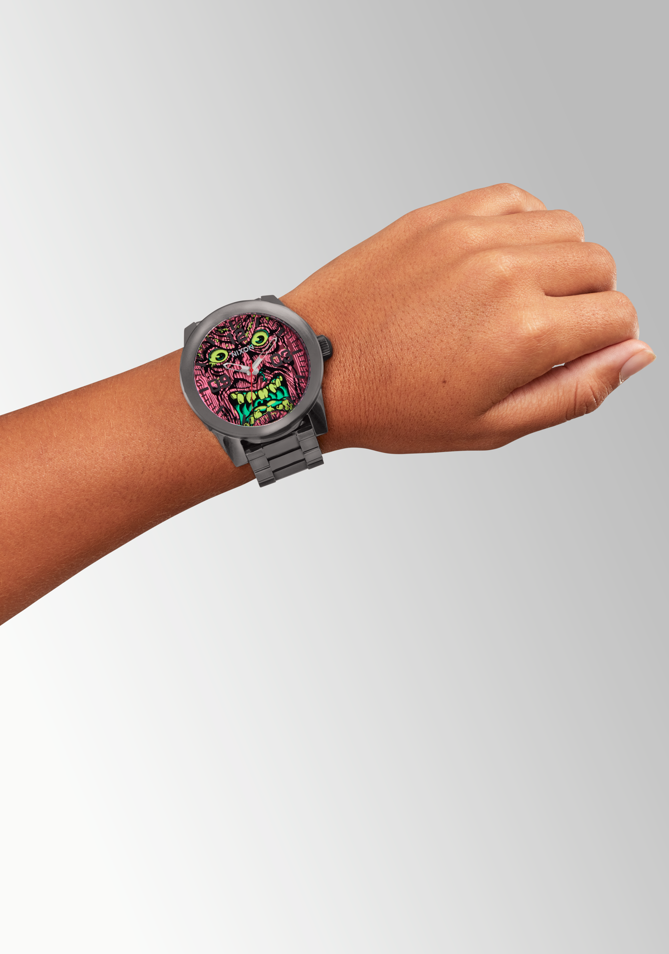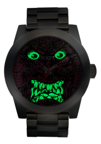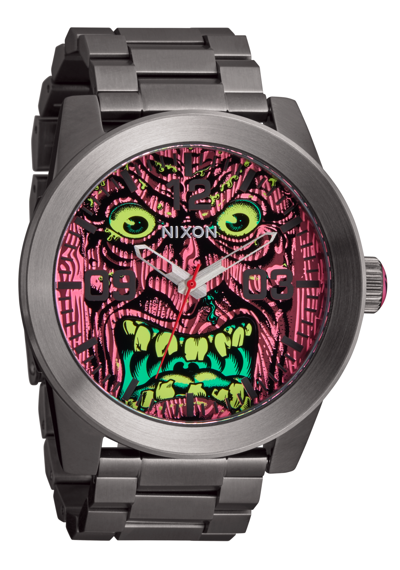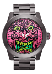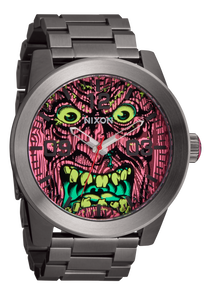 Individuelles Roskopp-Zifferblatt mit lumineszierenden Augen und Mund. Dazu eine pinke Nixon Wings Krone und ein maßgeschneiderter Gehäuseboden zum 50. Jubiläum von Santa Cruz.