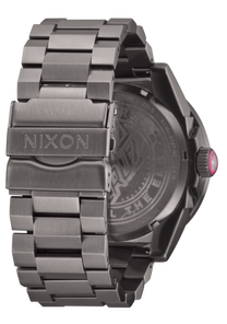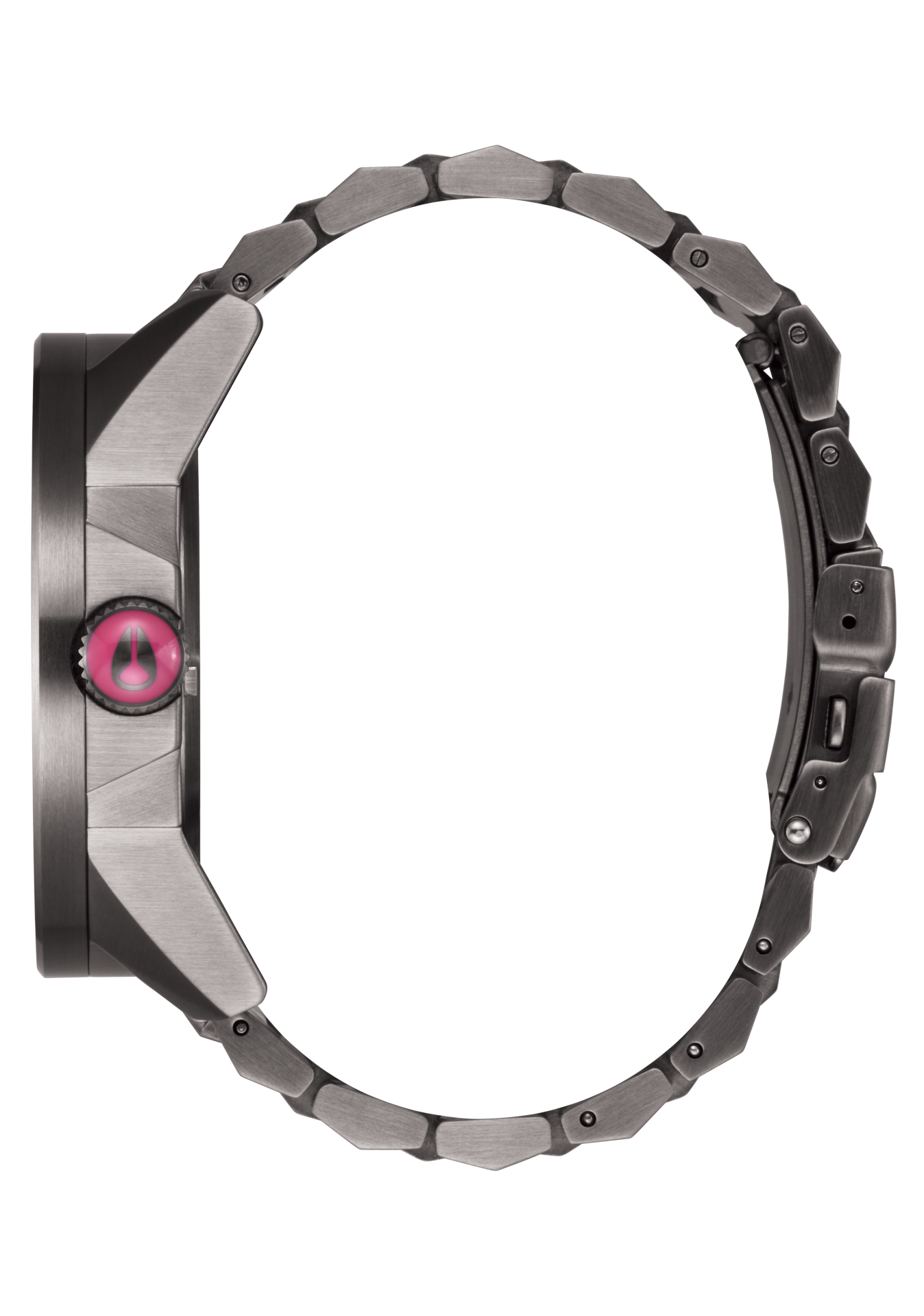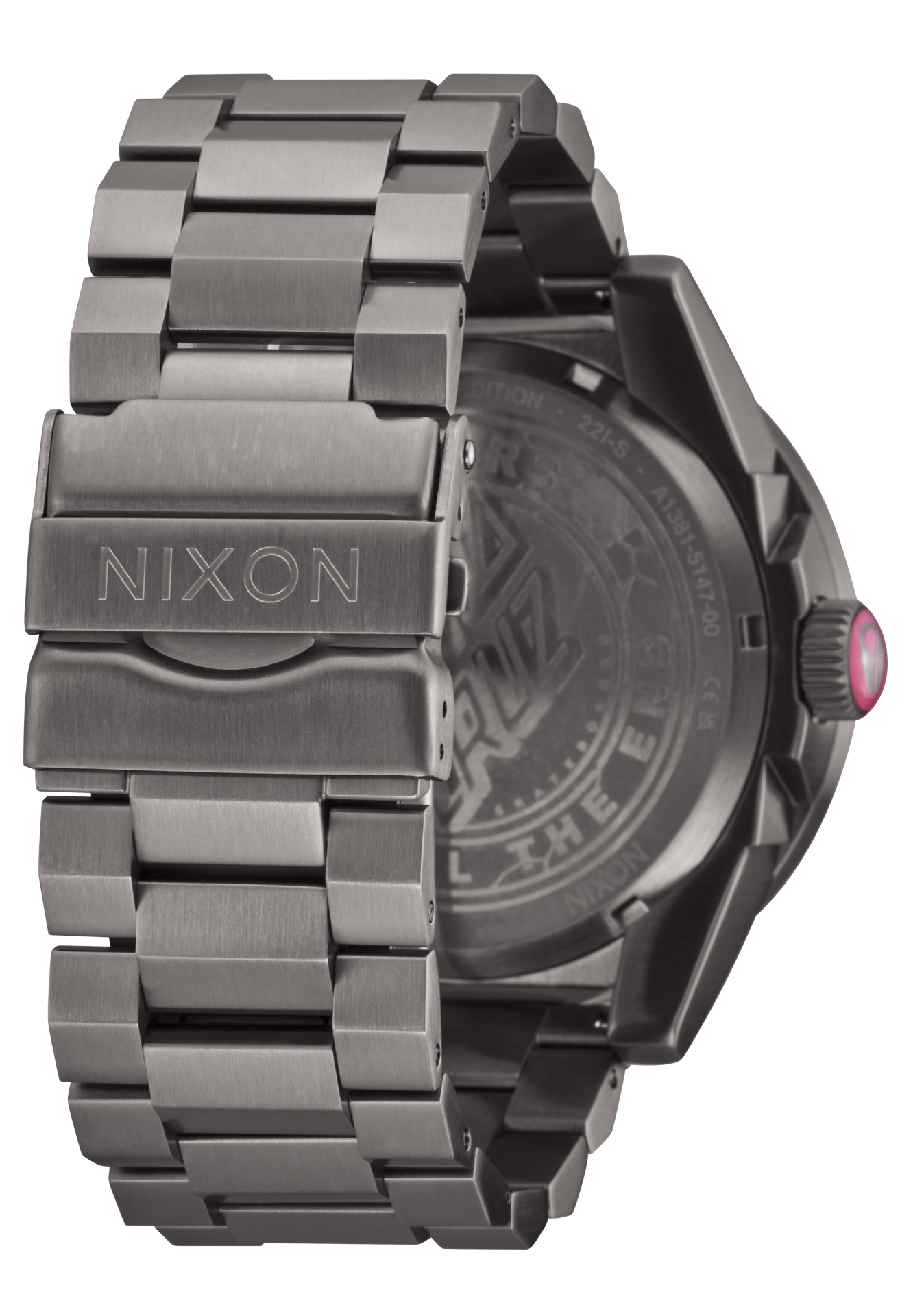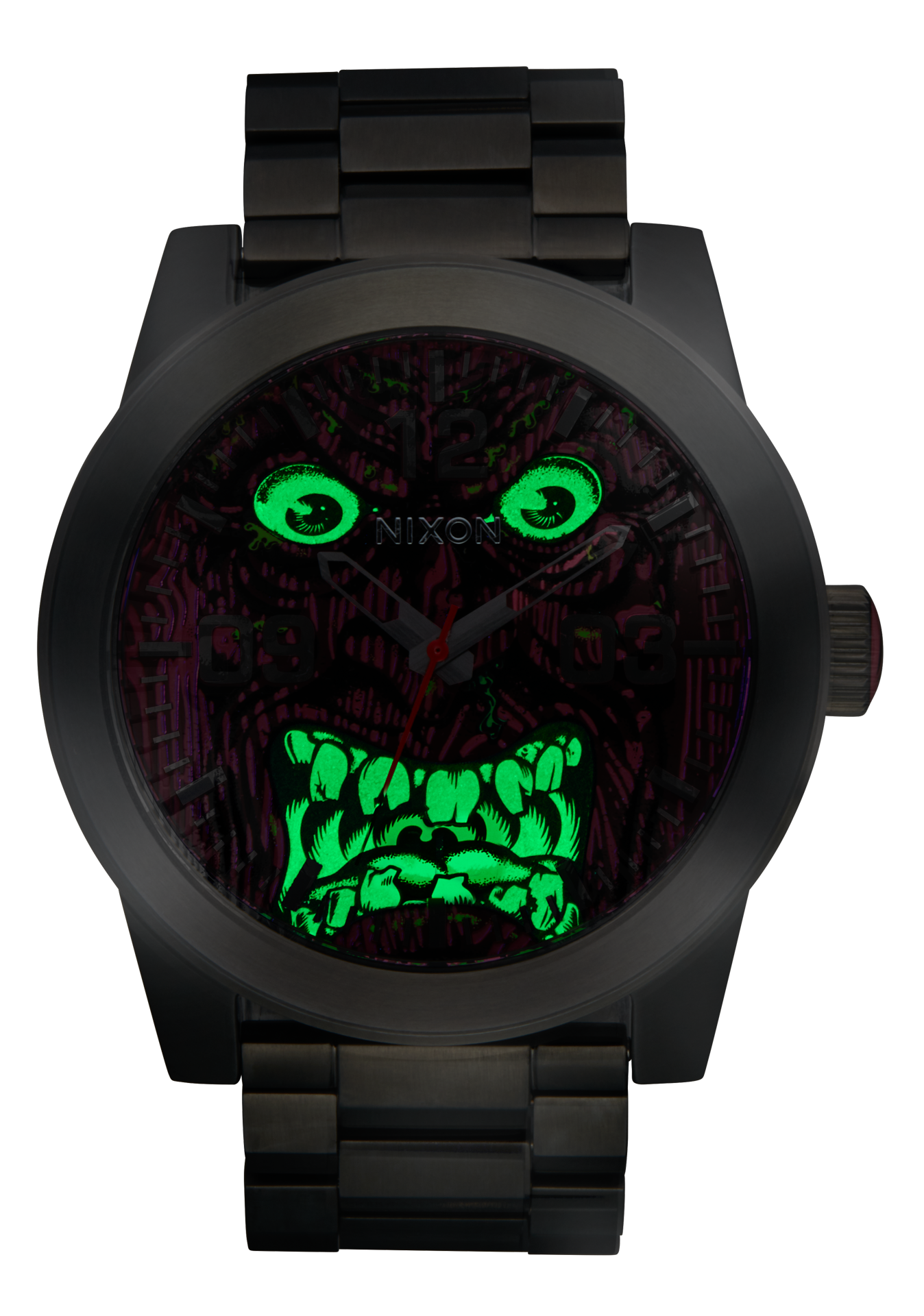 Individuelles Roskopp-Zifferblatt mit lumineszierenden Augen und Mund. Dazu eine pinke Nixon Wings Krone und ein maßgeschneiderter Gehäuseboden zum 50. Jubiläum von Santa Cruz.