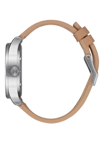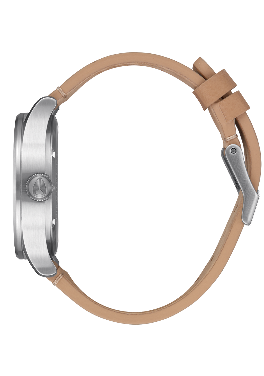 Die Sentry Lederuhr verwendet ein japanisches Miyota 0S20 Quarz-Uhrwerk mit drei Zeigern und einer zweisprachigen Tag- und Datumsanzeige (Englisch/Spanisch).