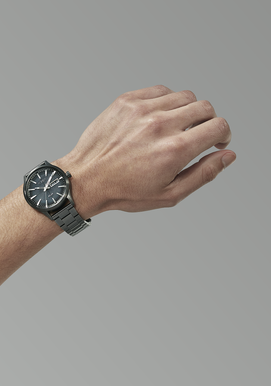 Das halbtransparente Zifferblatt verfügt über aufgesetzte Edelstahl-Stabindizes, das Nixon-Logo und ein Datumsfenster. Es ist außerdem mit einer aufgedruckten Sekundenanzeige und individuell leuchtenden, stahlfarbenen Skelettzeigern ausgestattet.