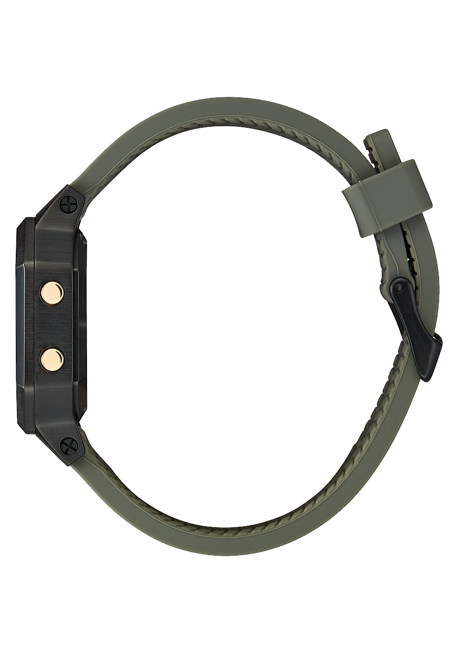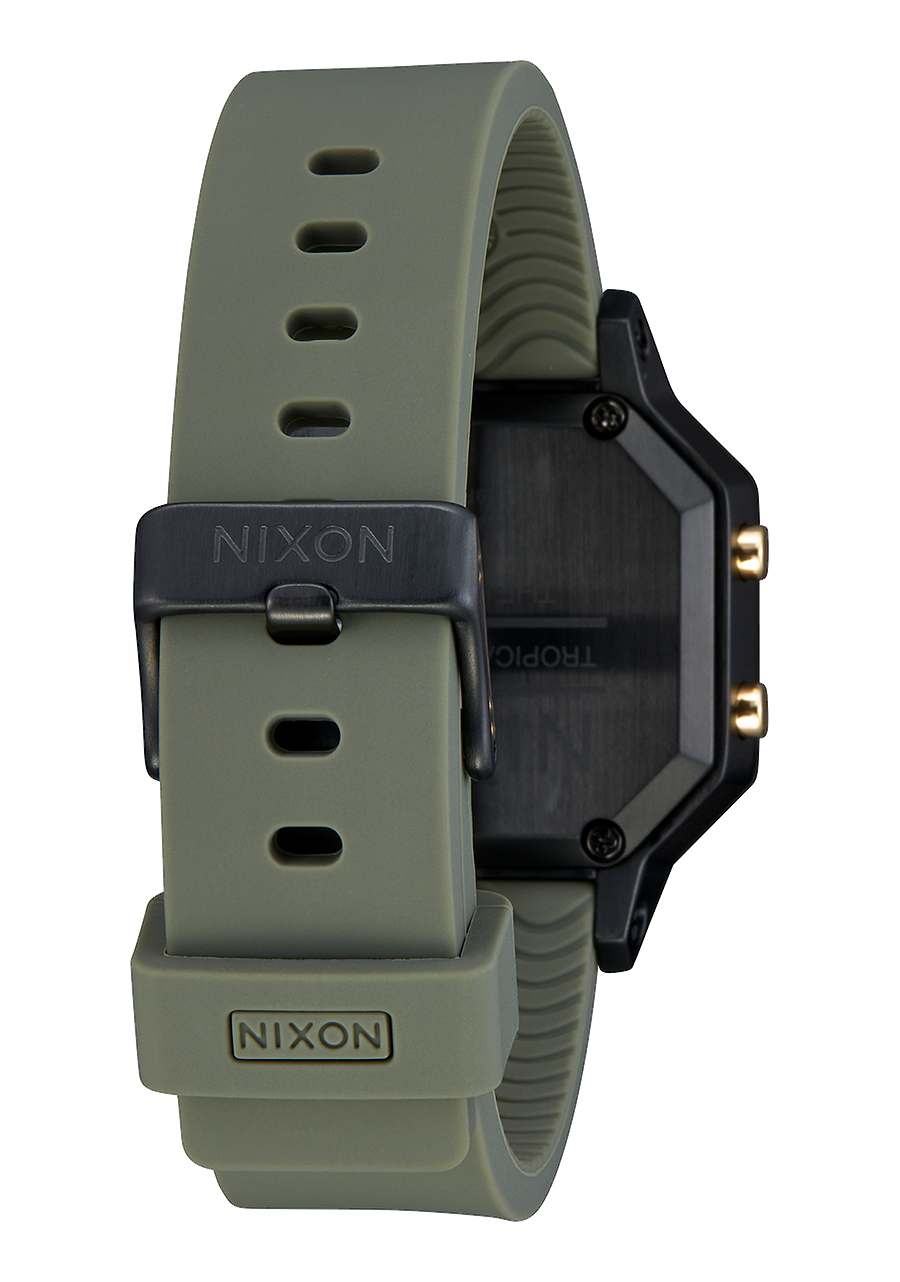 18-16 mm konisch zulaufendes, maßgefertigtes, ultrasoftes Silikon-Uhrenarmband mit patentiertem Verriegelungsschlaufenverschluss. Ebenfalls enthalten sind eine solide Edelstahlschließe und eine Schraubenstiftverbindung.
