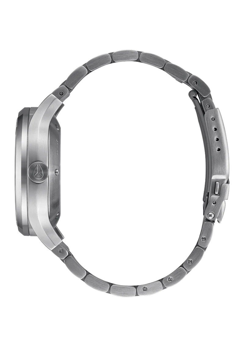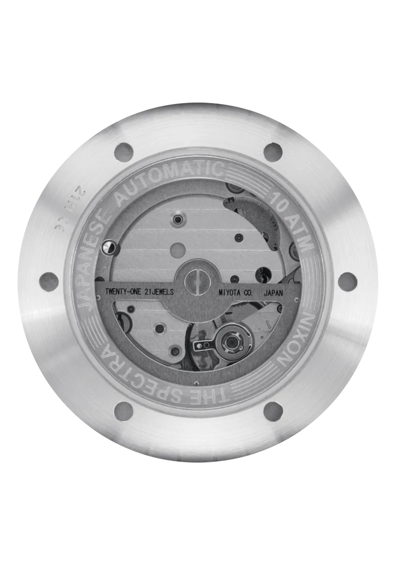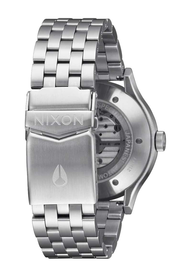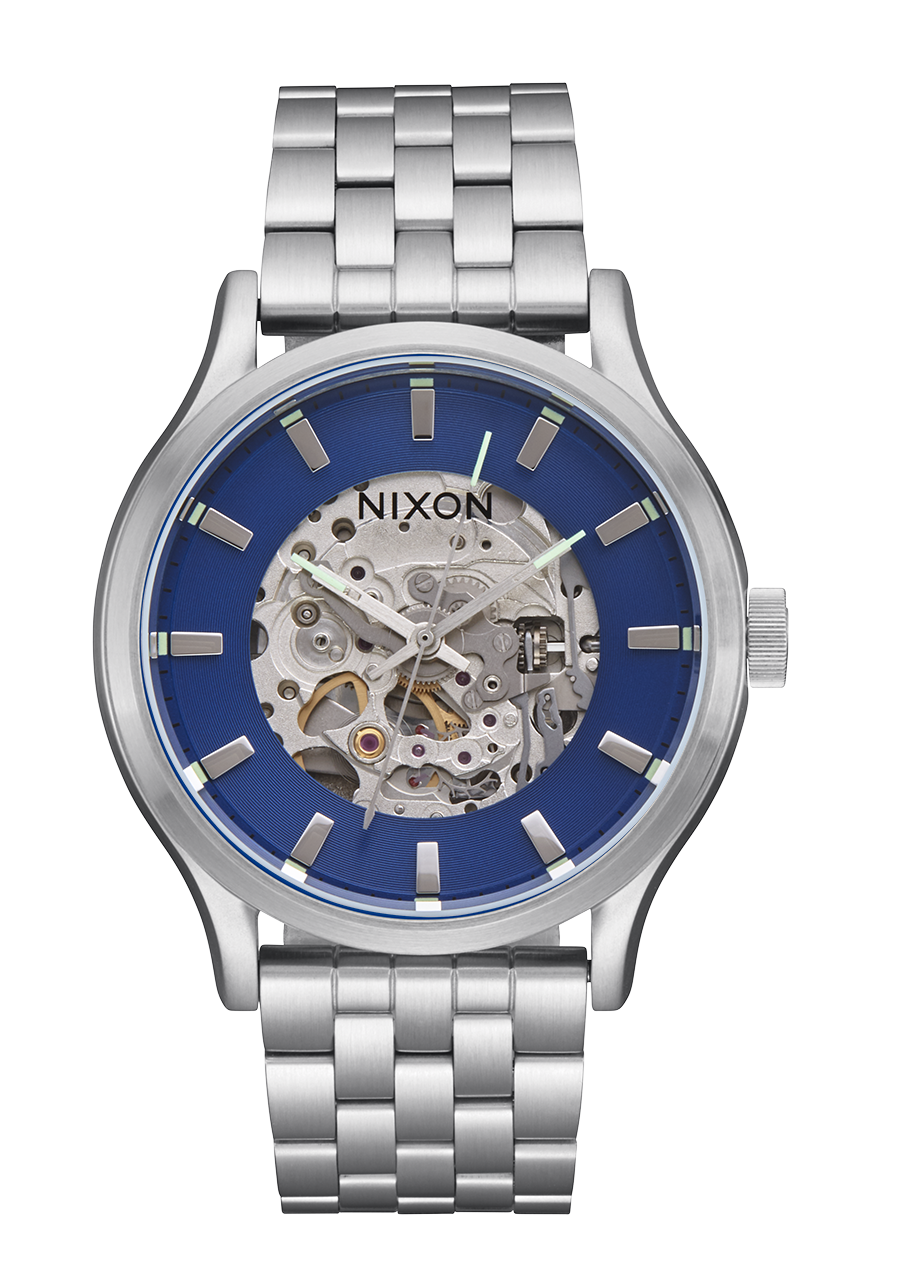 Das Skelettzifferblatt zeigt das automatische Uhrwerk. Das Zifferblatt verfügt über aufgesetzte, dreidimensionale Stabindizes. Das Nixon-Logo ist auf der Unterseite des Uhrglases angebracht, um zusätzliche Tiefe zu verleihen.