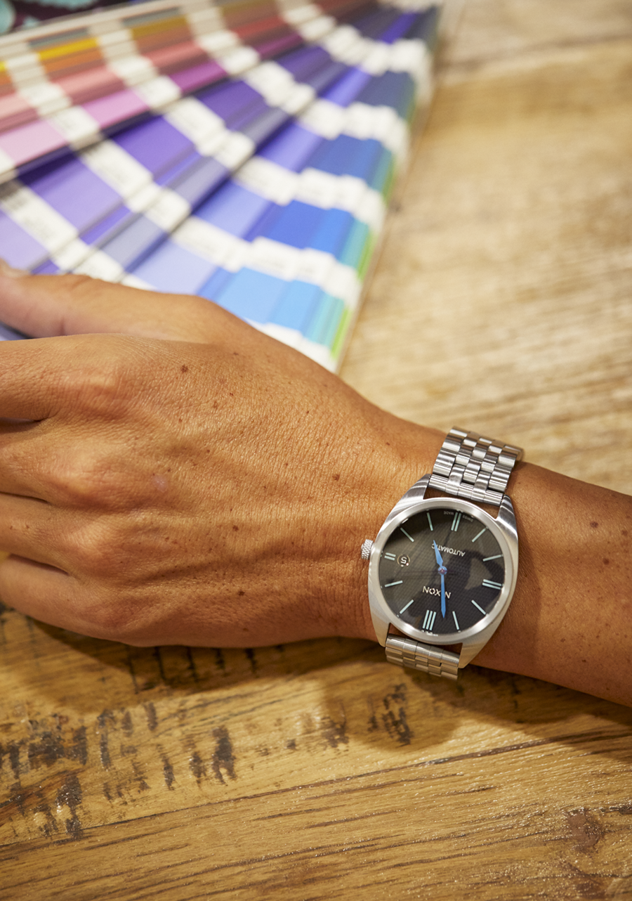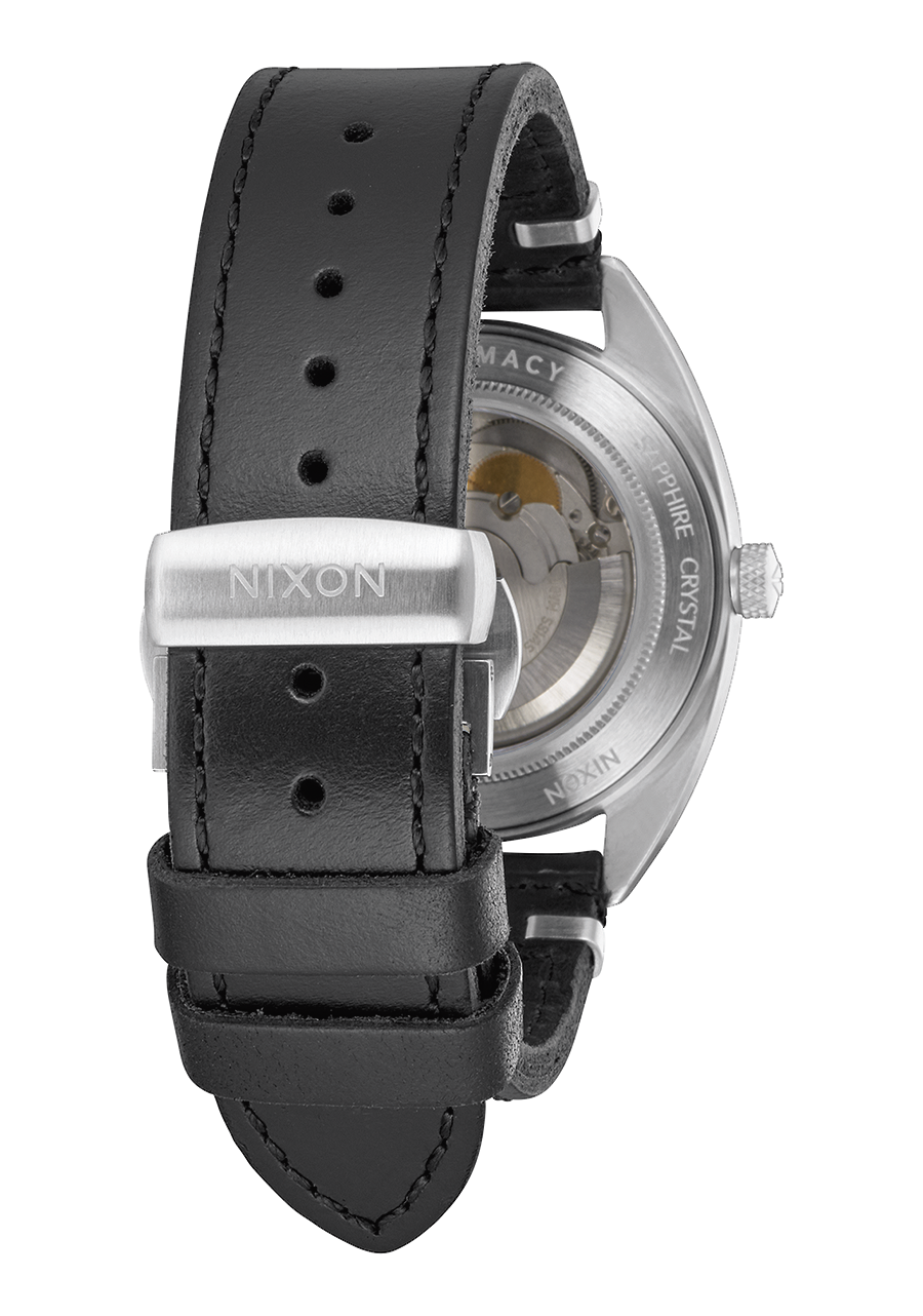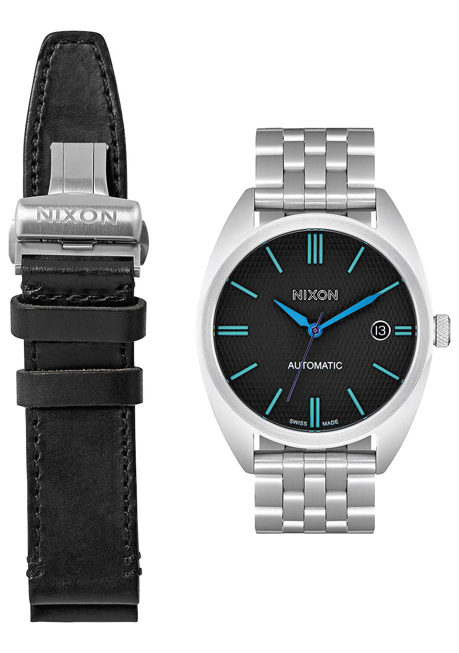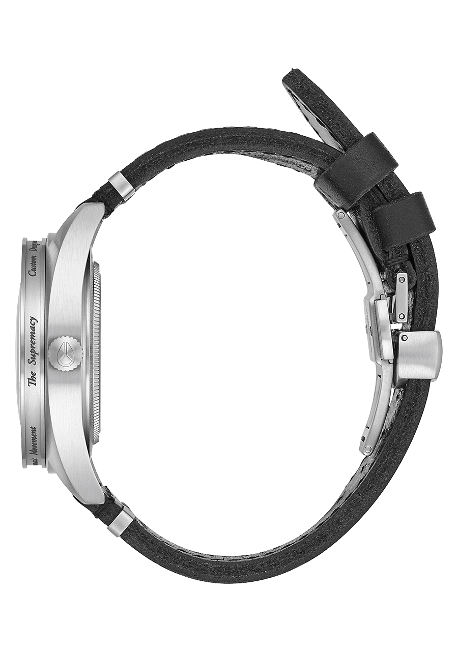 20 mm gebürstetes Edelstahlarmband mit einer maßgefertigten, massiven Edelstahl-Faltschließe. Alternativarmband ist ein Horween Aniline Chromexcel schwarzes Band mit gebürsteter Edelstahl-Faltschließe.