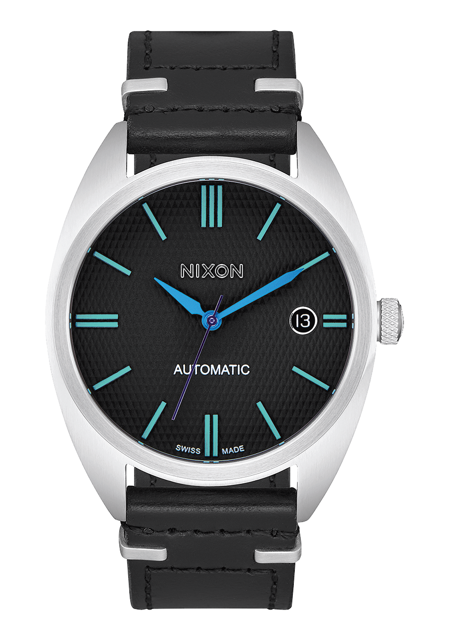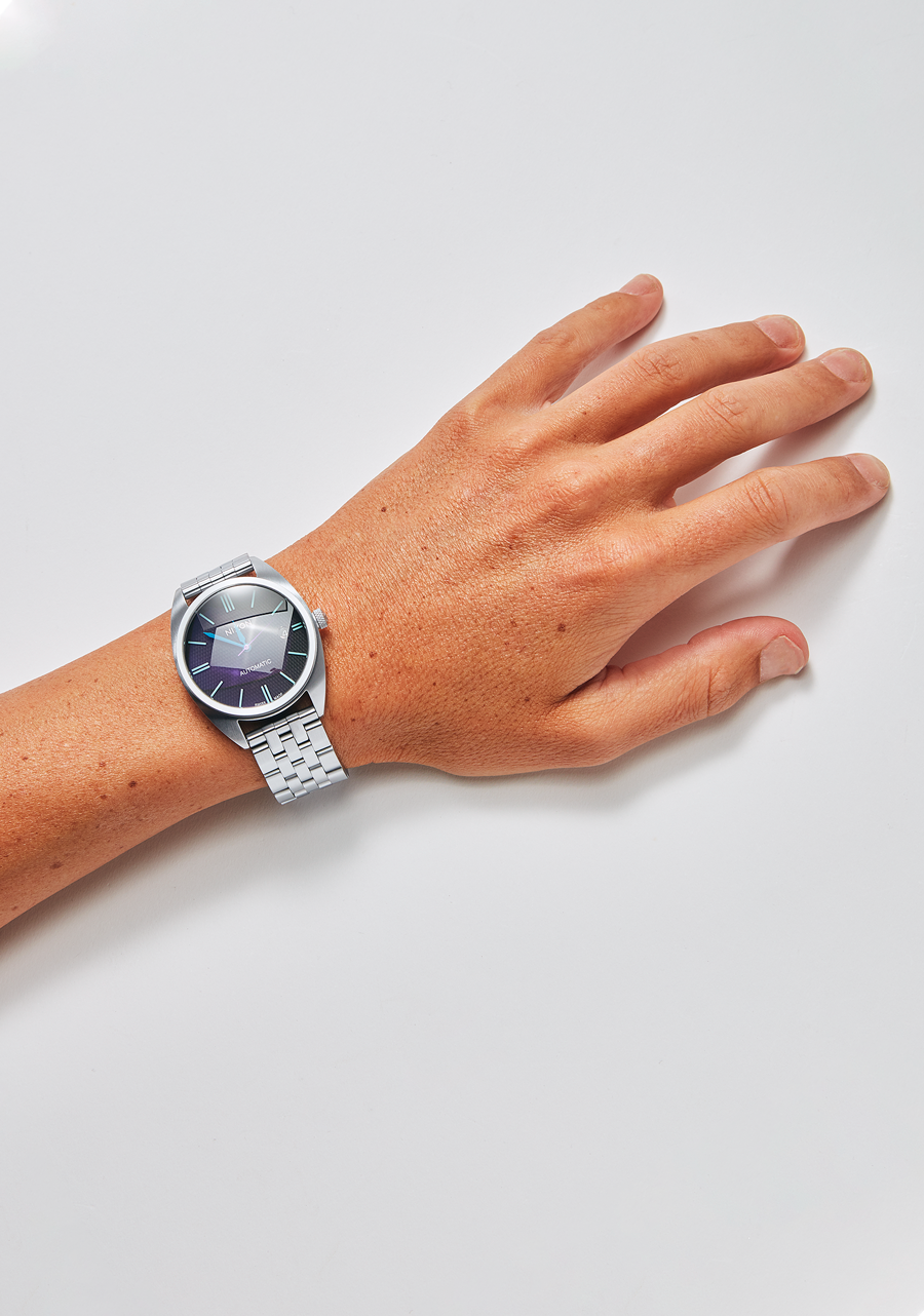 Das Zifferblatt verfügt über aufgesetzte Stabindizes und speziell geformte Zeiger.
