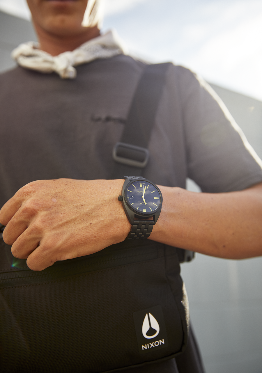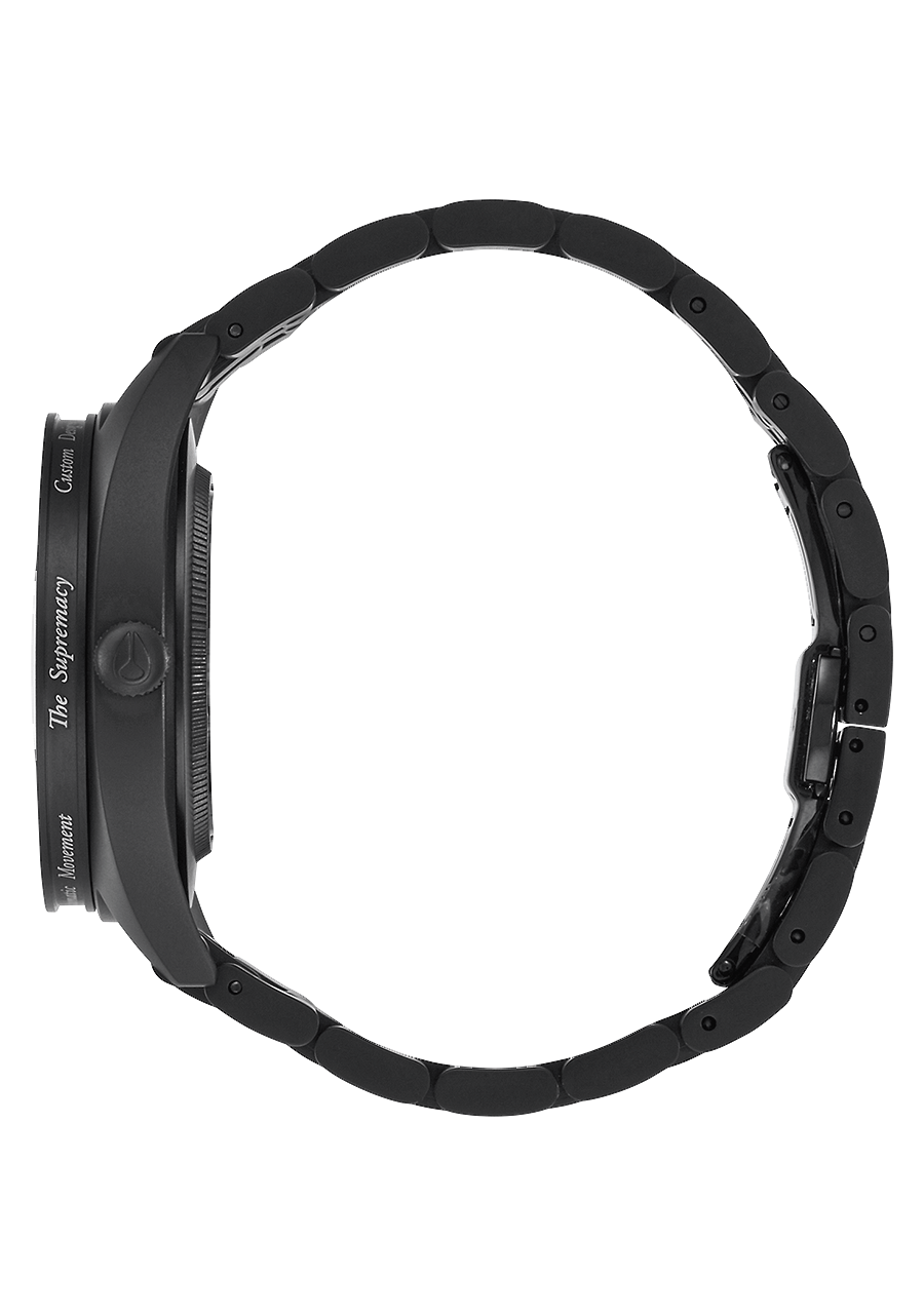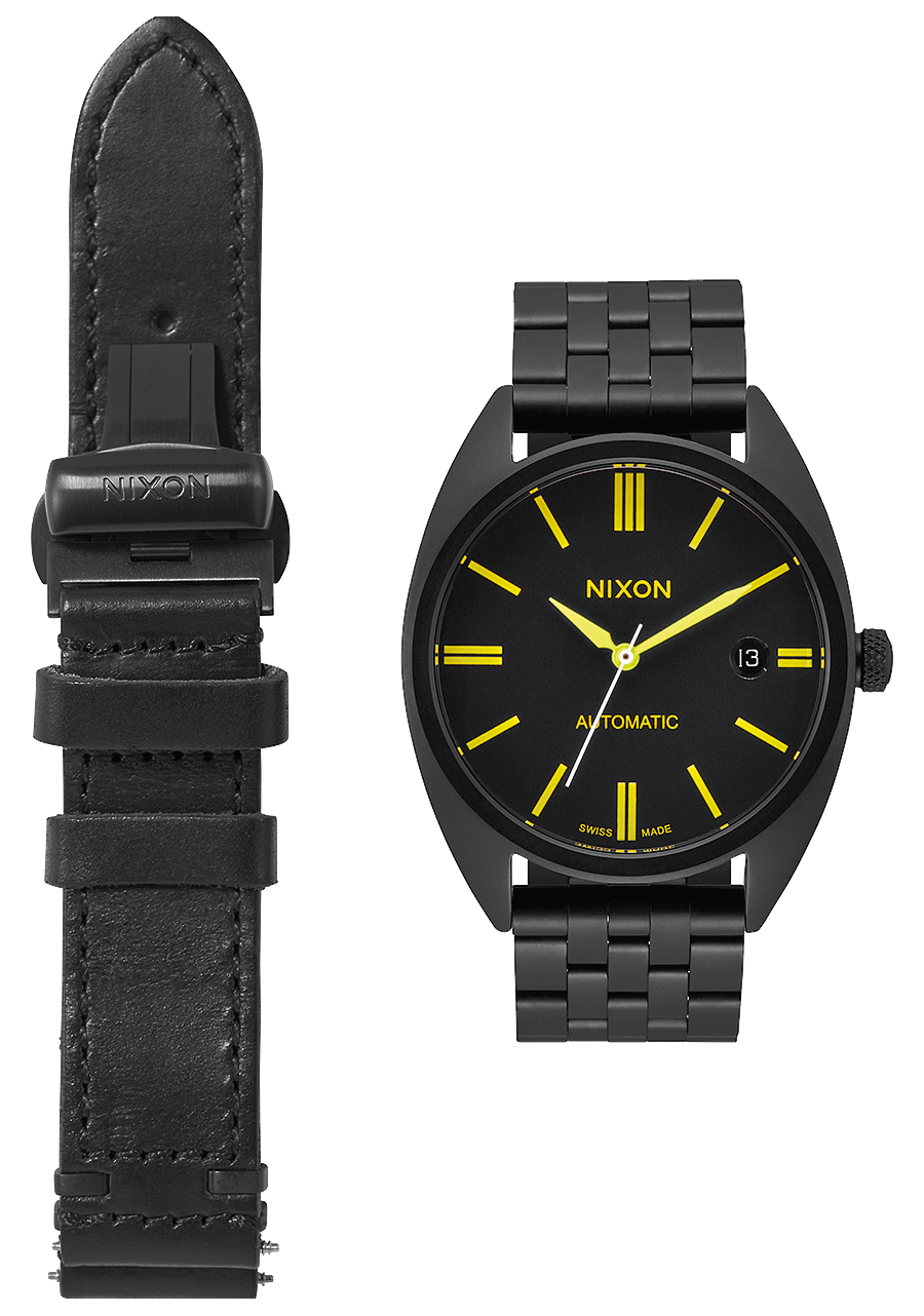 20 mm gebürstetes Edelstahlarmband mit einer maßgefertigten, massiven Edelstahl-Faltschließe. Alternativarmband ist ein Horween Aniline Chromexcel schwarzes Band mit gebürsteter Edelstahl-Faltschließe.