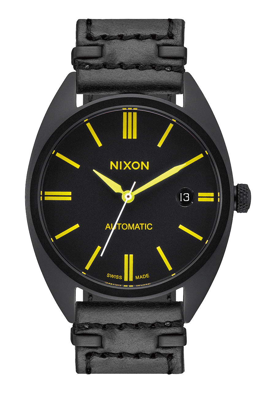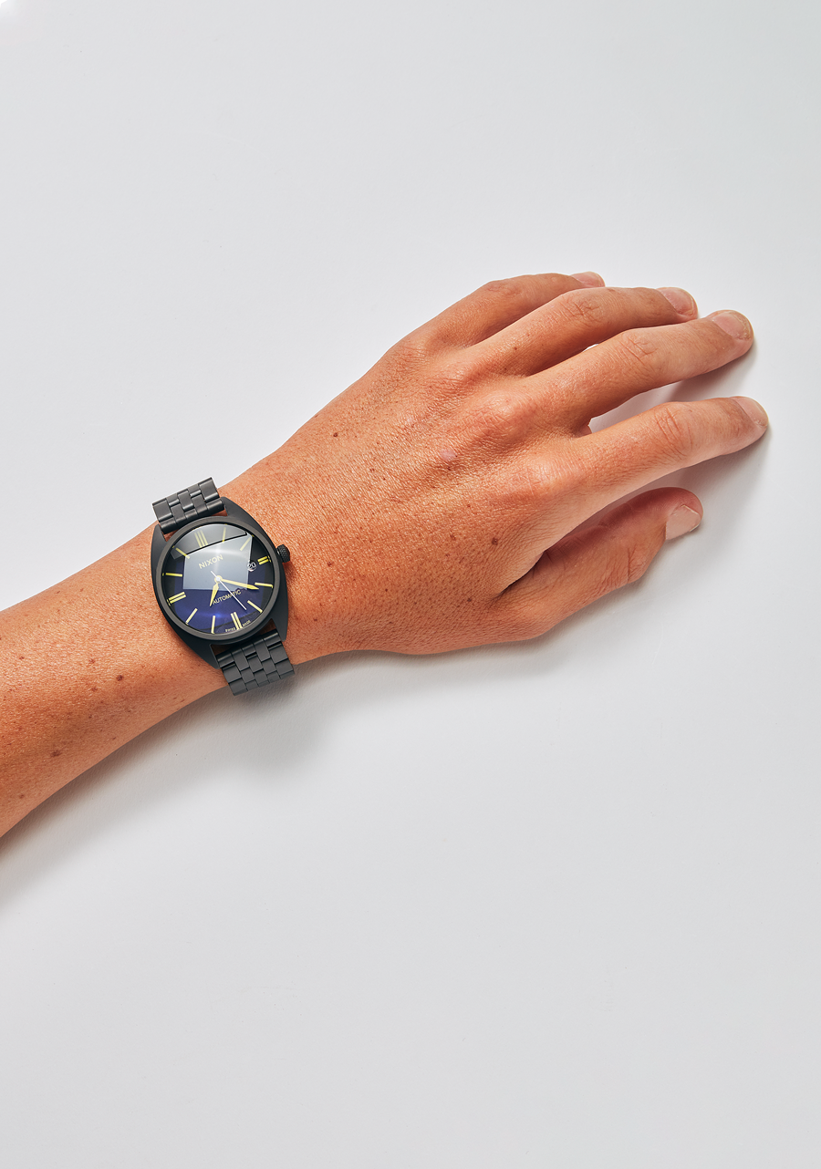 Das Zifferblatt verfügt über aufgesetzte Stabindizes und speziell geformte Zeiger.