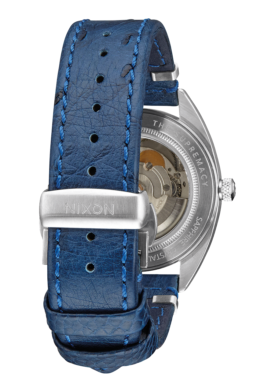 Das Gehäuse des Nixon Supremacy besteht aus maßgeschneidertem massivem Edelstahl. Sowohl ein Edelstahlarmband als auch ein Horween-Lederarmband sind enthalten.
