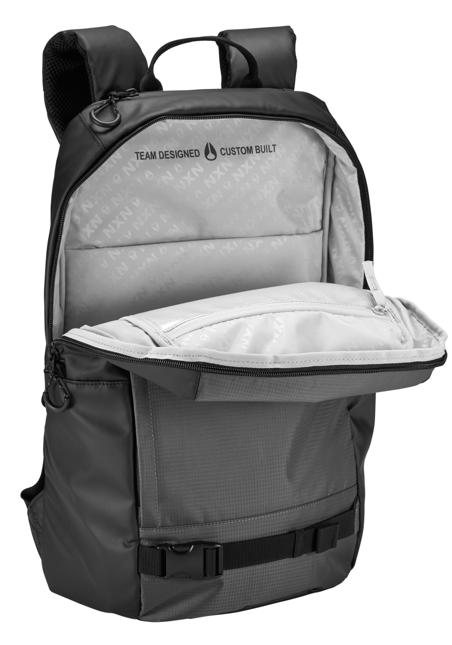 • Strapazierfähige Skate-Gurte auf der Vorderseite und Tasche für Wasserflaschen • Innere Werkzeugtasche für das Skate Tool • Spezielles, auslaufsicheres Fach, damit dein Wachs bei heissen Temperaturen nicht ausläuft. • Reflektierende Elemente • Gepolstertes Laptopfach für Laptops bis zu 15 Zoll • Oberes Schnellverschlussfach für Telefon und Schlüssel • Gepolsterter Netzrücken für Komfort und Belüftung • Gepolsterte Schultergurte mit verstellbaren Brustgurten für optimale Passform und Ergonomie