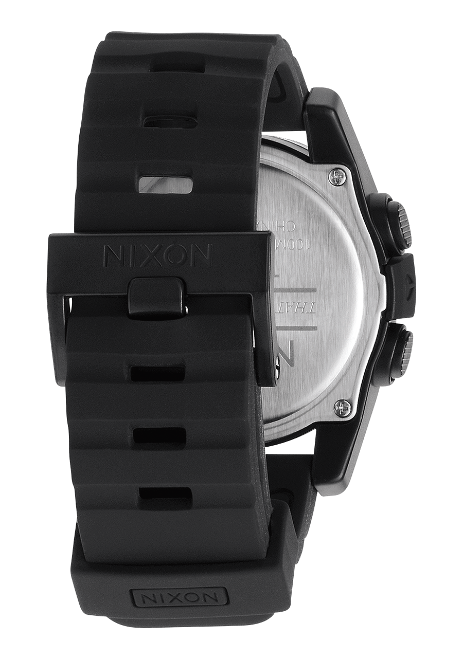 44 mm, 100 Meter/10 ATM, maßgefertigtes spritzgegossenes Polycarbonat-Gehäuse, fester Polycarbonat-Lünettenring, gehärtetes Mineralglas, doppelte Dichtung, maßgefertigte spritzgegossene Polycarbonat-Drücker, verschraubter Gehäuseboden und Federsteganstöße.